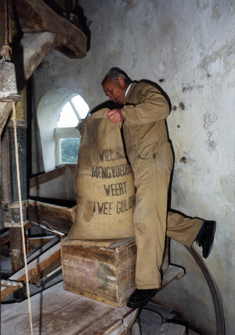 Molenaar Wiel Nijs vult meelzakken, medio 2001 GAW Beeldbank O.1283