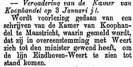In de editie van 5 januari 1900 is verslag gedaan van de vergadering van de Kamer van Koophandel. Tijdens de vergadering van 3 januari van dat jaar wordt een brief voorgelezen van de Kamer van Koophandel Maastricht.