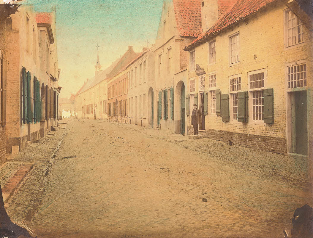 Hier zien we een ingekleurde foto van de Maasstraat uit circa 1890. Straatverlichting ontbrak nog en het rioleringsstelsel bestond uit goten langs de weg.