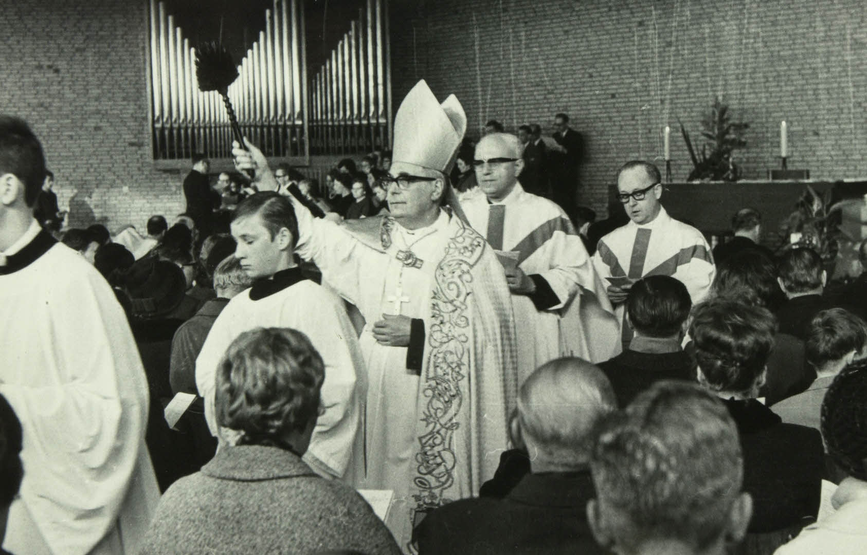 Mgr. Moors, bisschop van Roermond, zegent op 8 april 1967 de nieuwe kerk voor de parochie Groenewoud in. De kerk krijgt de naam 'De Goede Herder'. Na de inzegening wordt een heilige mis gevierd.
