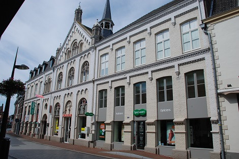 Het voormalig klooster van de zusters Ursulinen is uitgevoerd in een neoromaanse stijl en bestaat uit vier delen met elk een eigen opzet. ![]() WetenswaardigHet voormalig klooster is opgesplitst in een horecagedeelte, meerdere winkel- en kantoorruimten en een aantal appartementen. Aan de achterzijde van het gehele pand zijn ingrijpende bouwkundige aanpassingen uitgevoerd. Tot het voormalig kloostercomplex behoort tevens de Mariakapel aan de Ursulinenhof Het horecagedeelte in het hoekpand Langstraat 20 Het object maakt deel uit van het beschermd stadsgezicht I. Binnenstad met uitlopers Klik op de icoontjes in de rechterkolom voor meer informatie. | Terugblik1876Start van de bouw van het pand voor de vestiging van de zusters Ursulinen. 1967De gevel van de kapel wordt aan de zijde van de entree gemoderniseerd. 1989Op 23 juni vindt een plechtige H. Eucharistieviering in de St. Martinuskerk plaats waarbij de erkentelijkheid wordt uitgesproken voor de vele diensten die de zusterorde Ursulinen voor Weert heeft bewezen. 1991Voor het realiseren van de winkelpanden, appartementen en kantoren verstrekt het college van burgemeester en wethouders op 12 januari een vergunning. In 1992 en 1994 volgen nog twee wijzigingsvergunningen. Lees ook