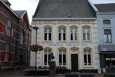 Dit huis in L-vorm dateert uit de zestiende tot achttiende eeuw. In latere jaren wordt de lijstgevel aan de straatkant gepleisterd. De achtervleugel is een bakstenen puntgevel met vlechtingen. ![]() WetenswaardigDe oudste delen van het object stammen uit de zestiende eeuw. Sinds 1871 is er de herensociëteit Amicitia gevestigd. Het object maakt onderdeel uit van het beschermd stadsgezicht I. Binnenstad met uitlopers Klik op de icoontjes in de rechterkolom voor meer informatie. | Terugblik1871De herensociëteit Amicitia, in 1842 opgericht in het er tegenover liggende café 'Het Bruine Paard' koopt het pand. 1873De Sociëteit Amicitia en de gemeente sluiten op 20 juni een overeenkomst voor het gebruik van de drinkwaterpomp die op een gemeenschappelijk perceel staat. De gemeente plaatst een scheidingsmuur. 2005Het voorste gedeelte van de benedenverdieping wordt gerestaureerd en geschilderd. Het pand wordt aan de achterzijde uitgebreid naar een ontwerp van de Weerter architect Ton Wijnhoven. 2016Het horecagedeelte krijgt door de komst van een particuliere ondernemer een open karakter. Lees ook